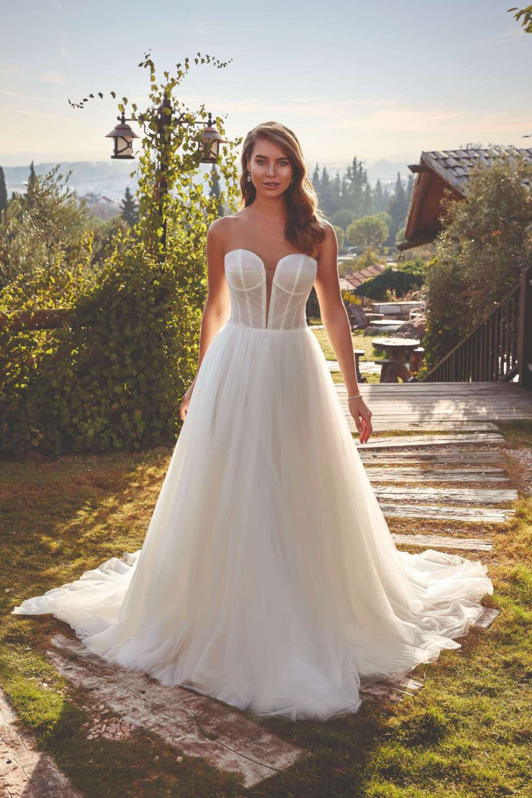 • Angelina is the embodiment of graceful simplicity, with layered tulle creating a soft, flowing ballgown silhouette. The clean strapless bodice enhances its timeless appeal.