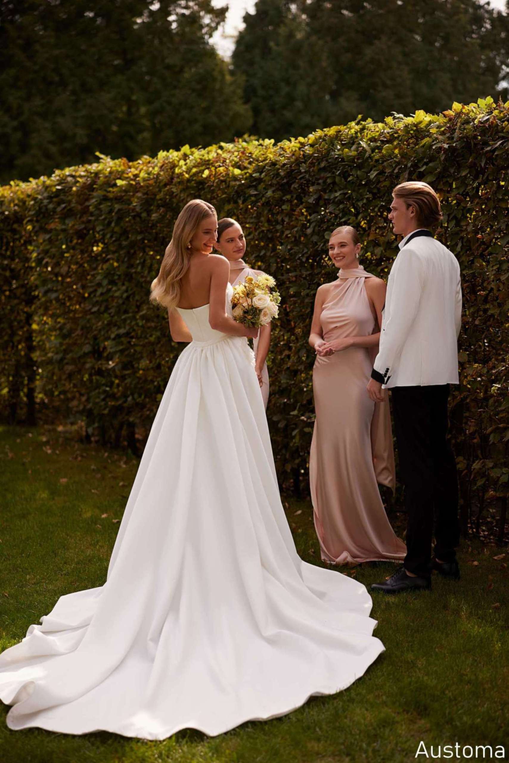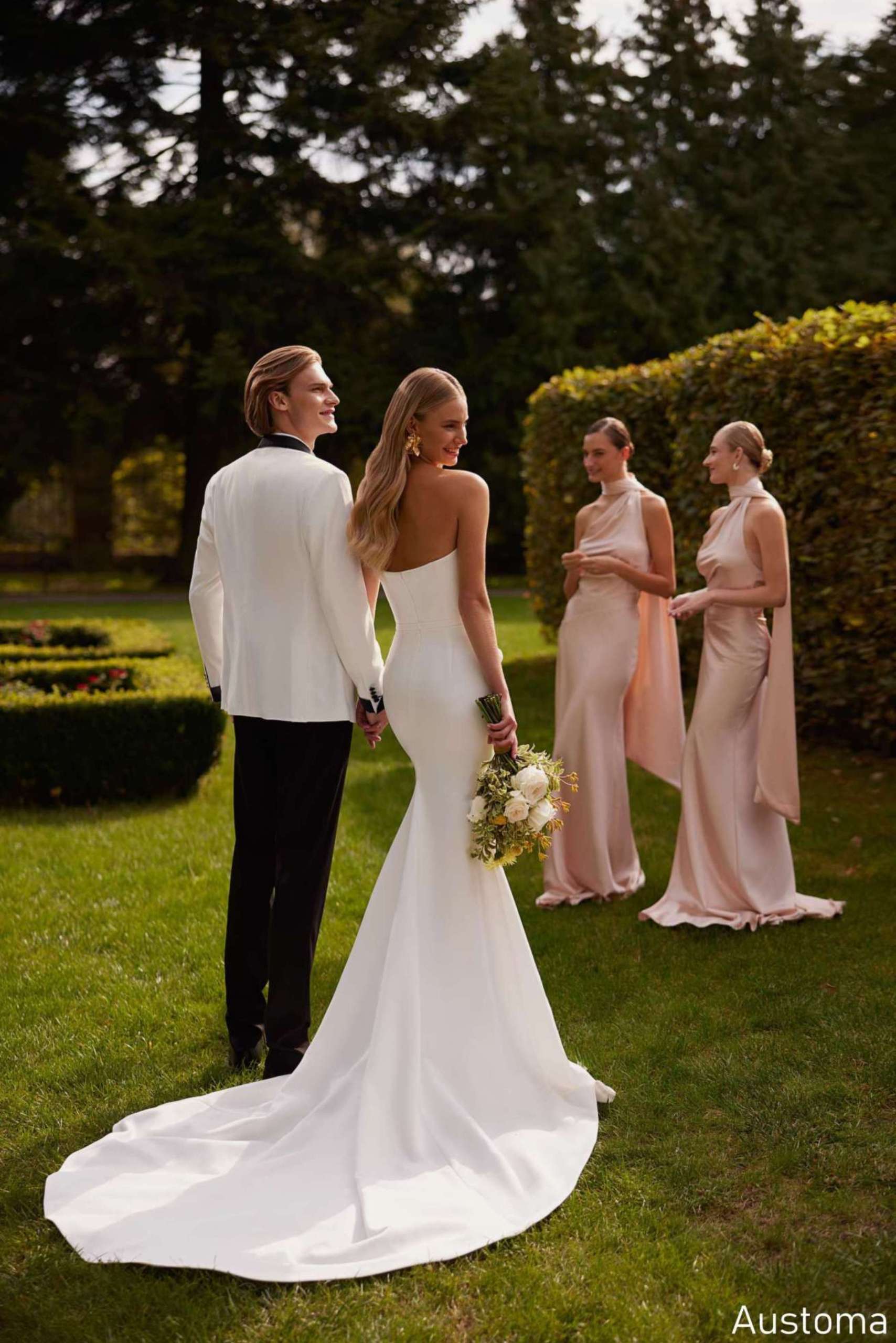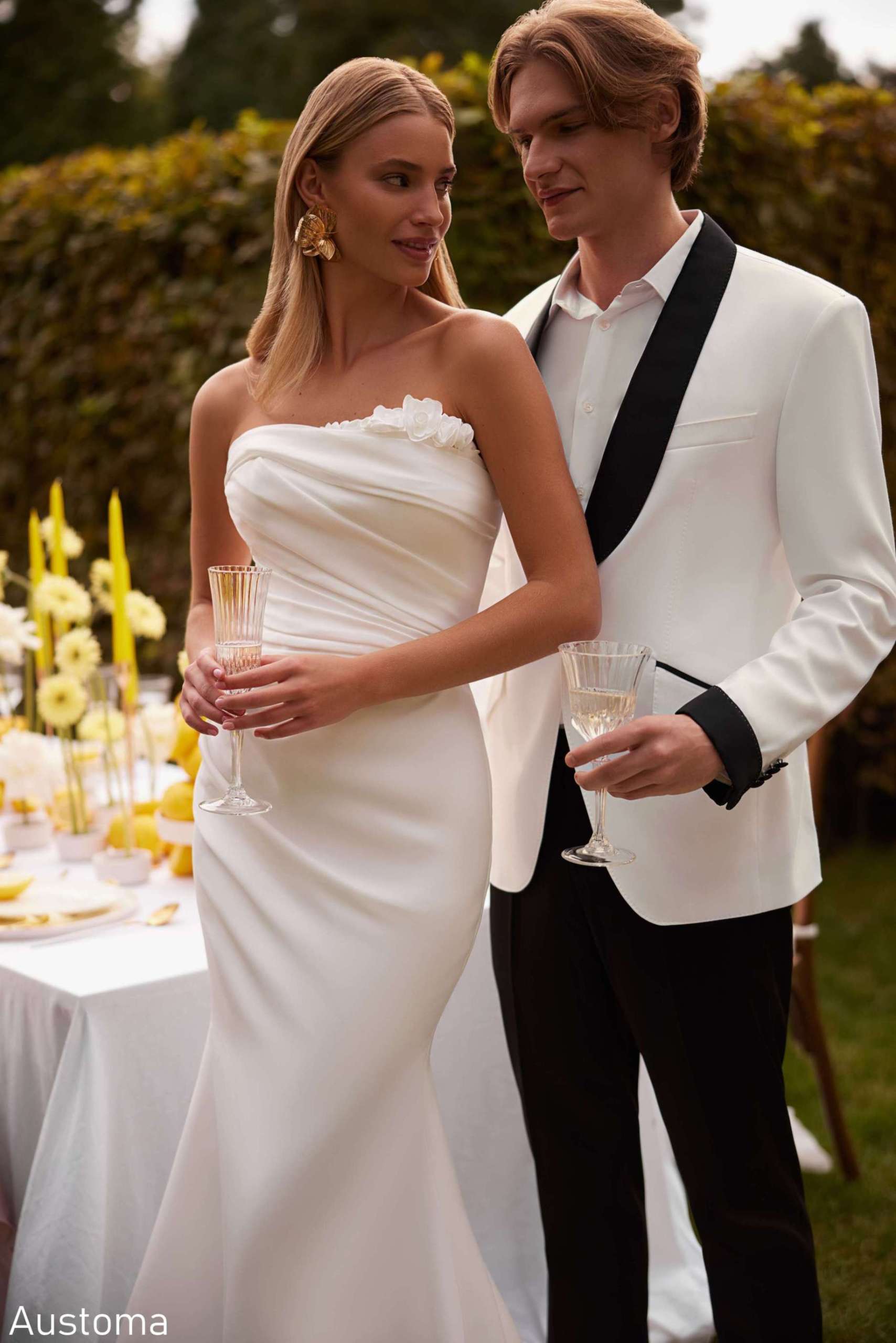 • Austoma is a study in modern minimalism, defined by clean lines and refined detail. An asymmetrical draped bodice is artfully accented with delicate floral elements at the waist.