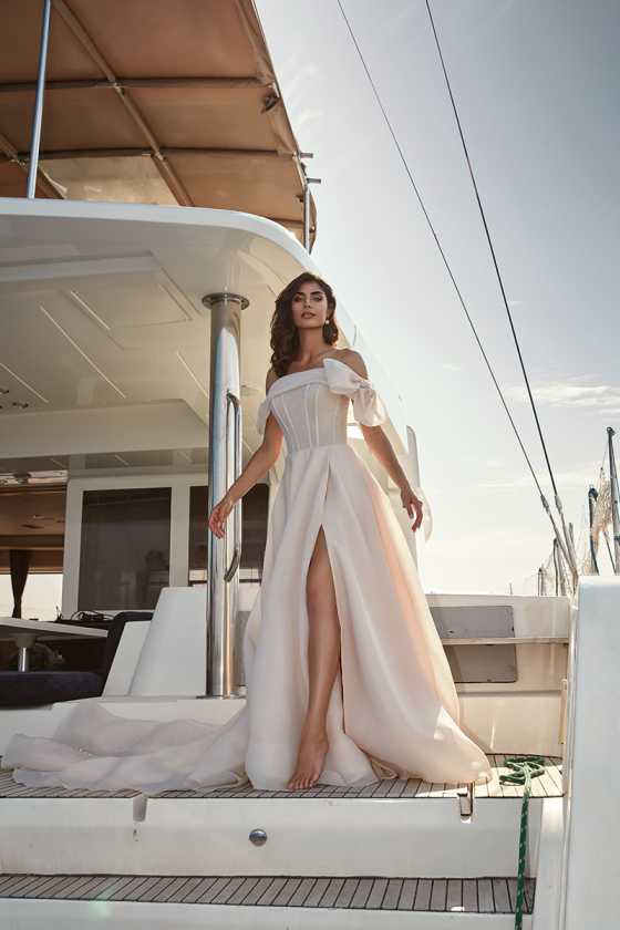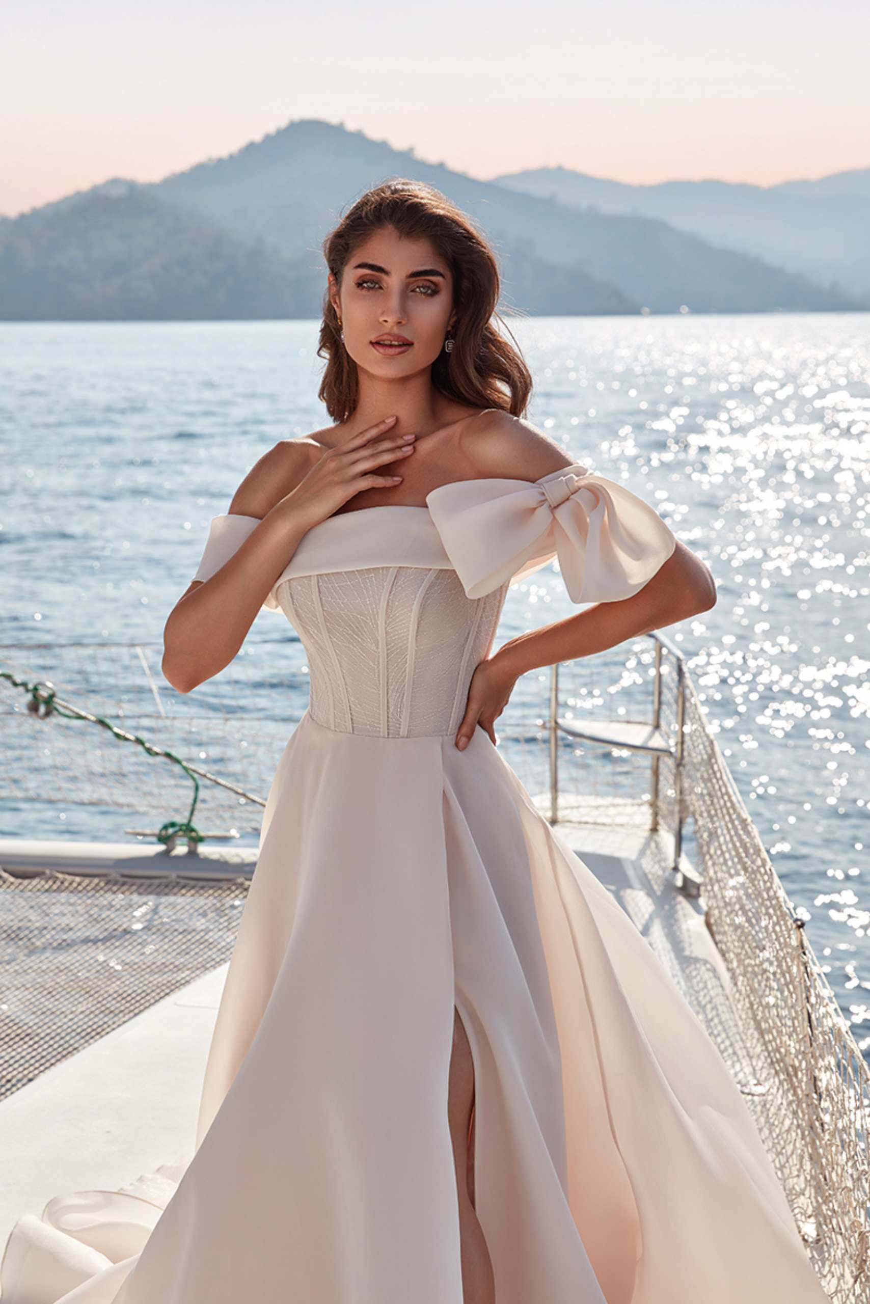 • Cecilia radiates playful glamour with its glittering tulle and softly structured off-shoulder design. The voluminous skirt, paired with a subtle slit, adds movement and a hint of allure.