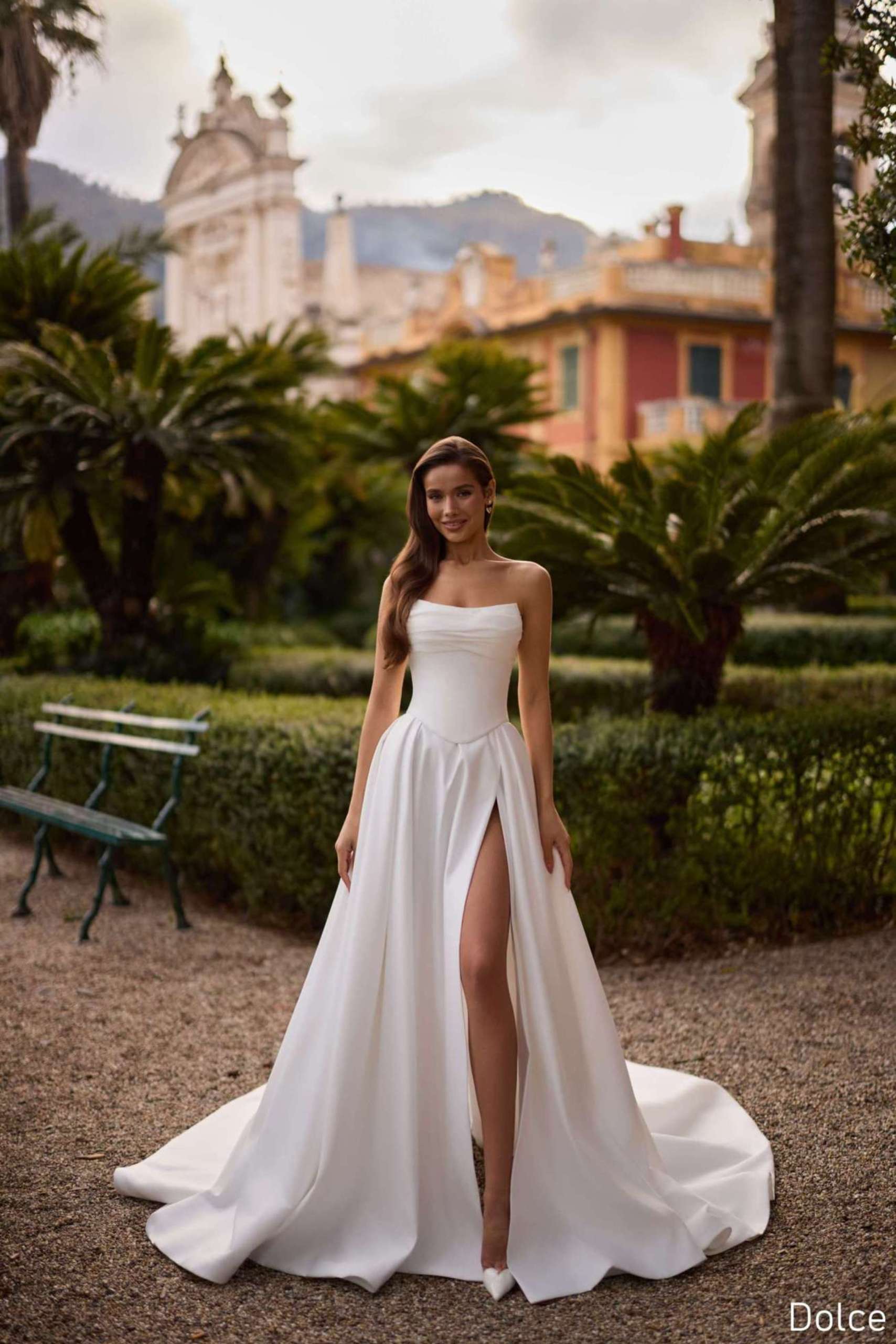 • Dolce evokes effortless allure and contemporary refinement. Its minimalist bodice with an open shoulder line feels soft yet modern, while the gently voluminous skirt and high slit create graceful movement and quiet confidence.
