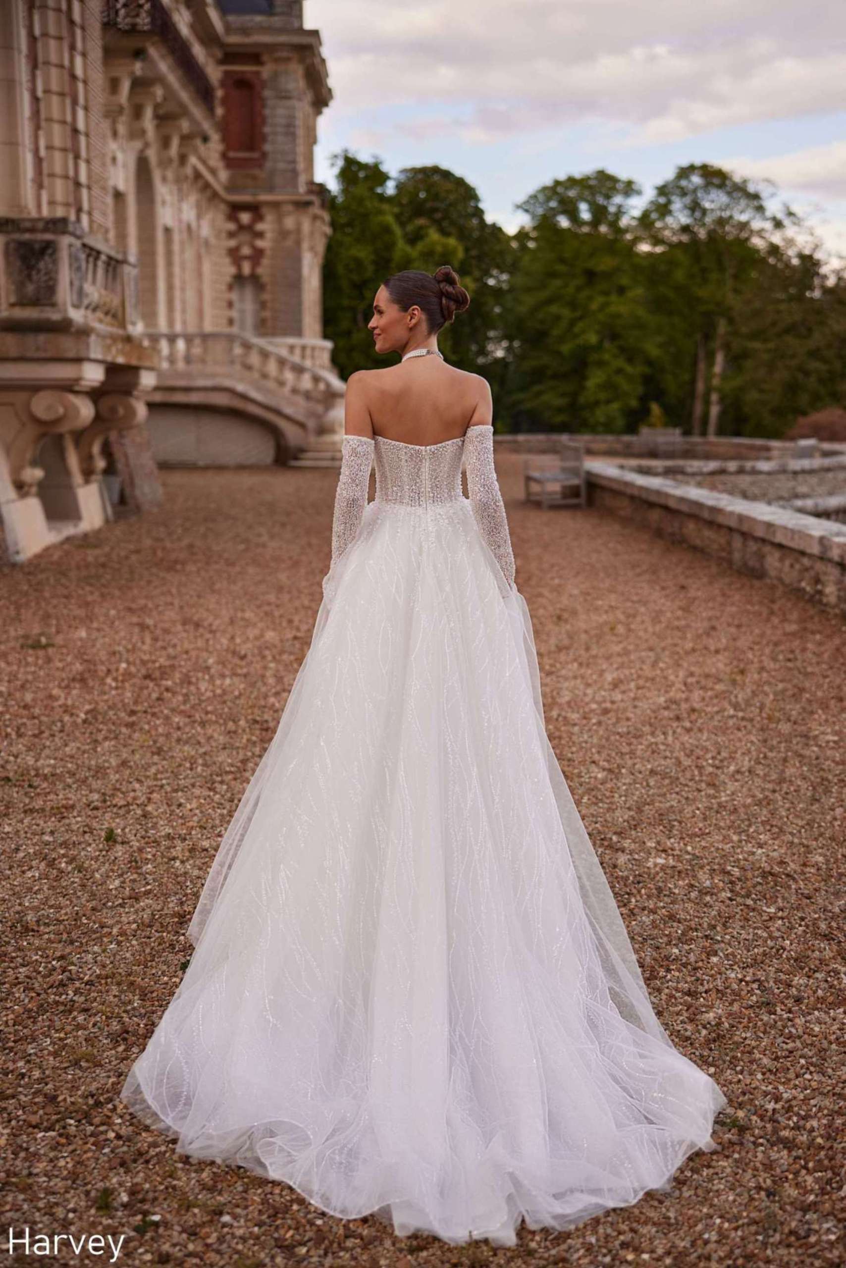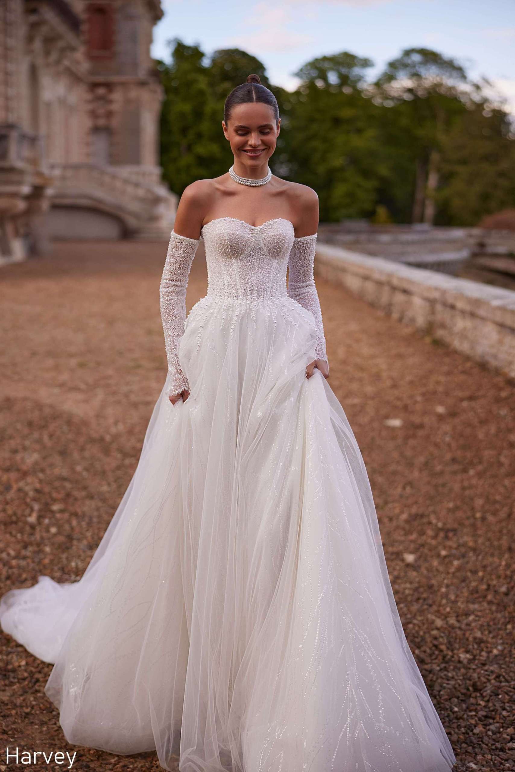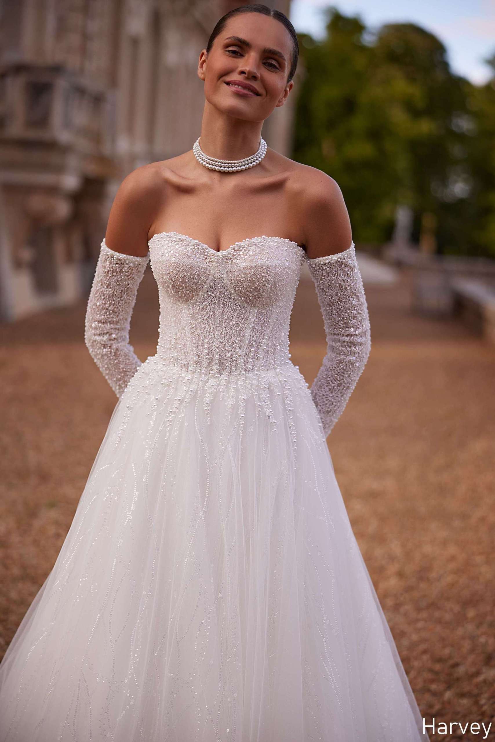 • Harvey is a statement of modern opulence. A structured corset adorned with luminous beadwork sculpts the figure, while a multi-layered skirt adds depth and movement.
