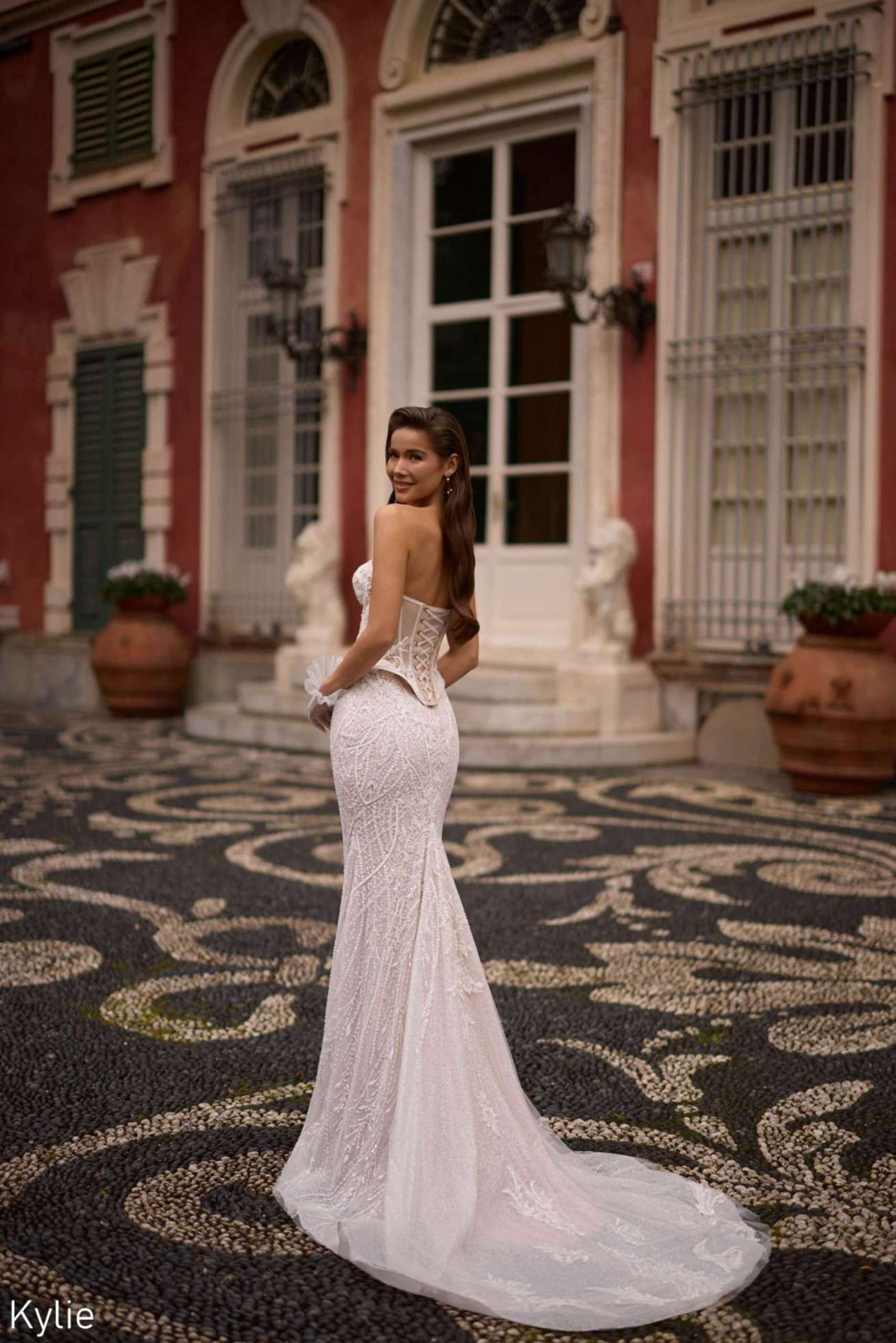 • Kylie is a captivating mermaid silhouette, defined by a structured corset bodice intricately embroidered to sculpt and accentuate the waist. The design flows seamlessly into a refined, elongated train.