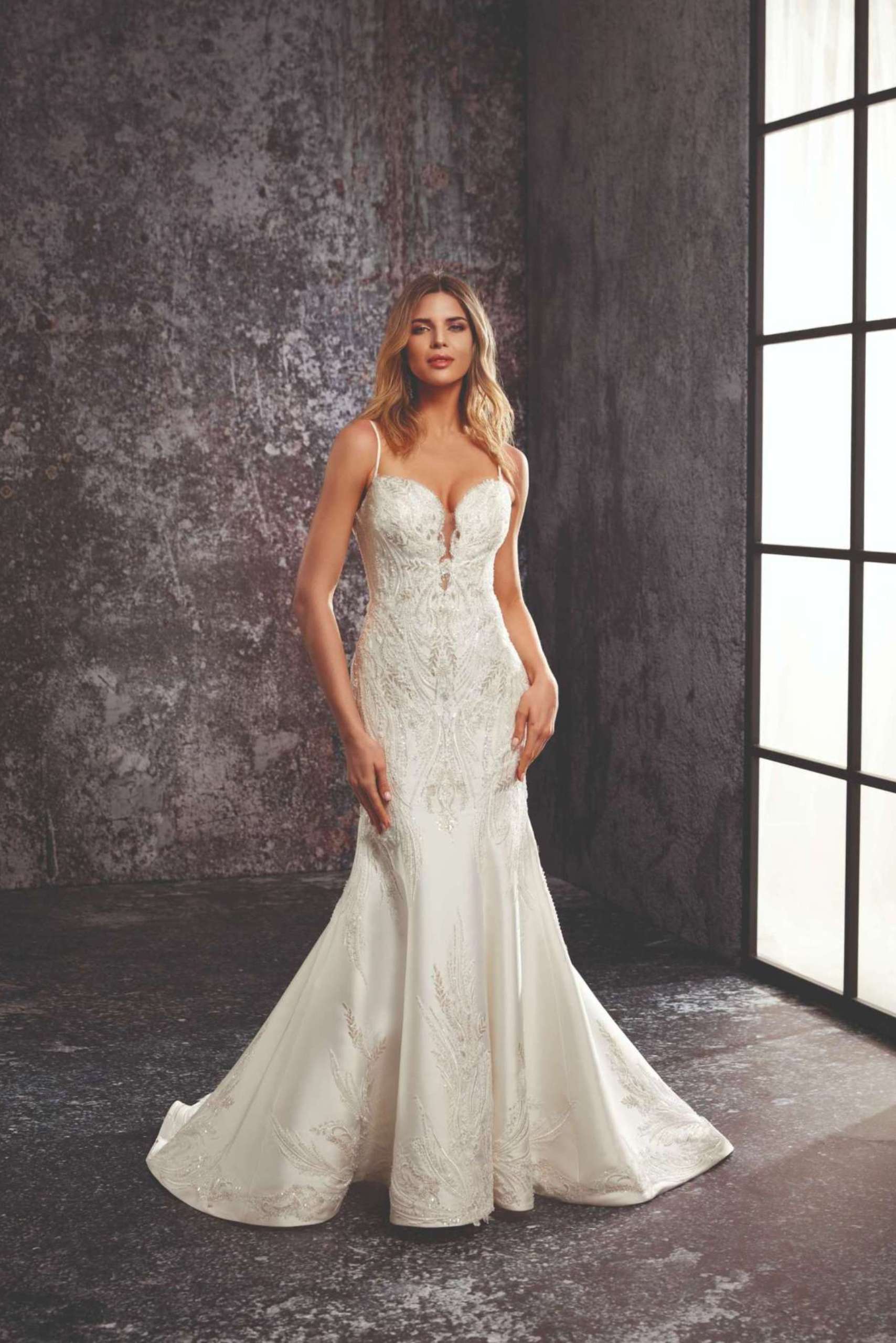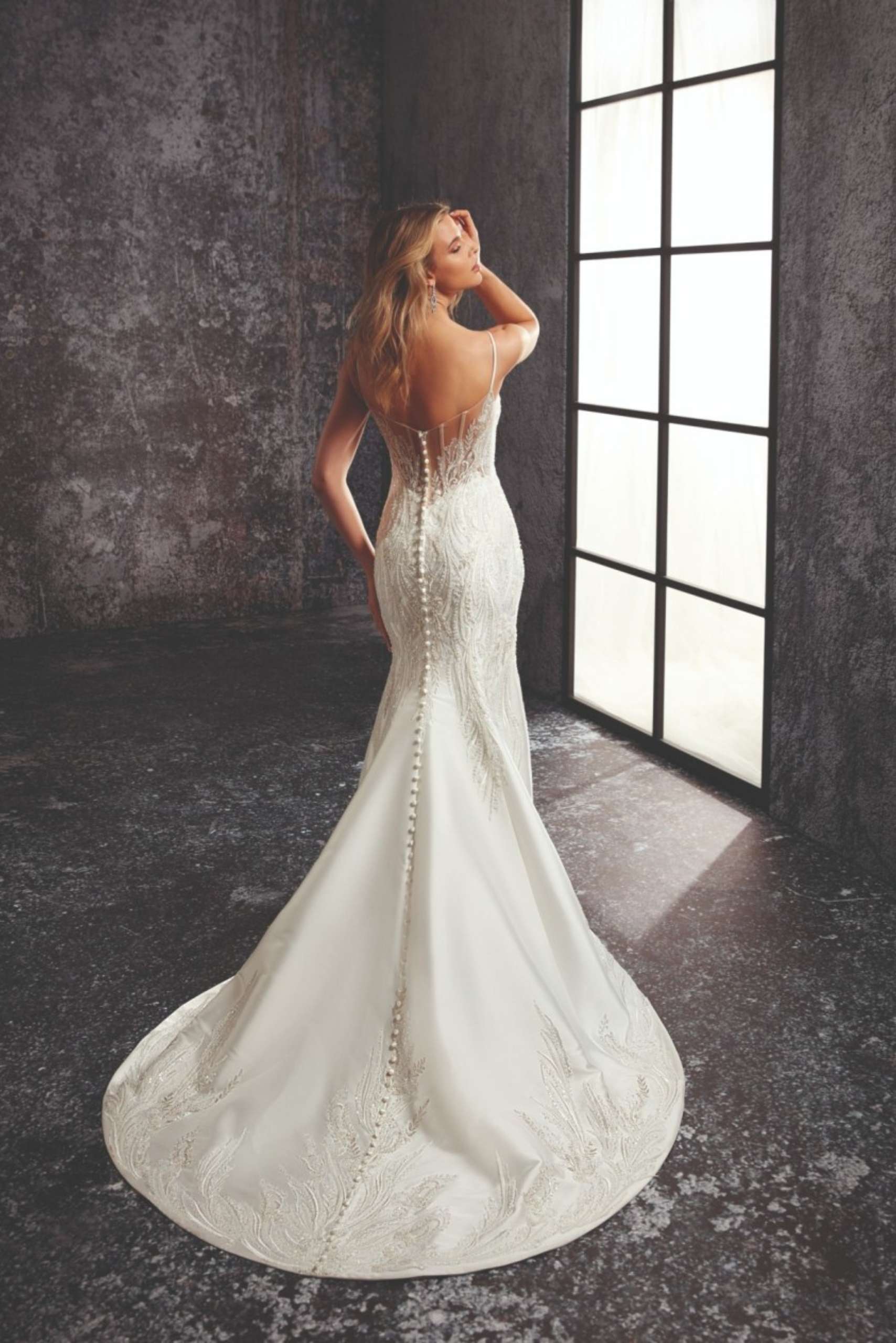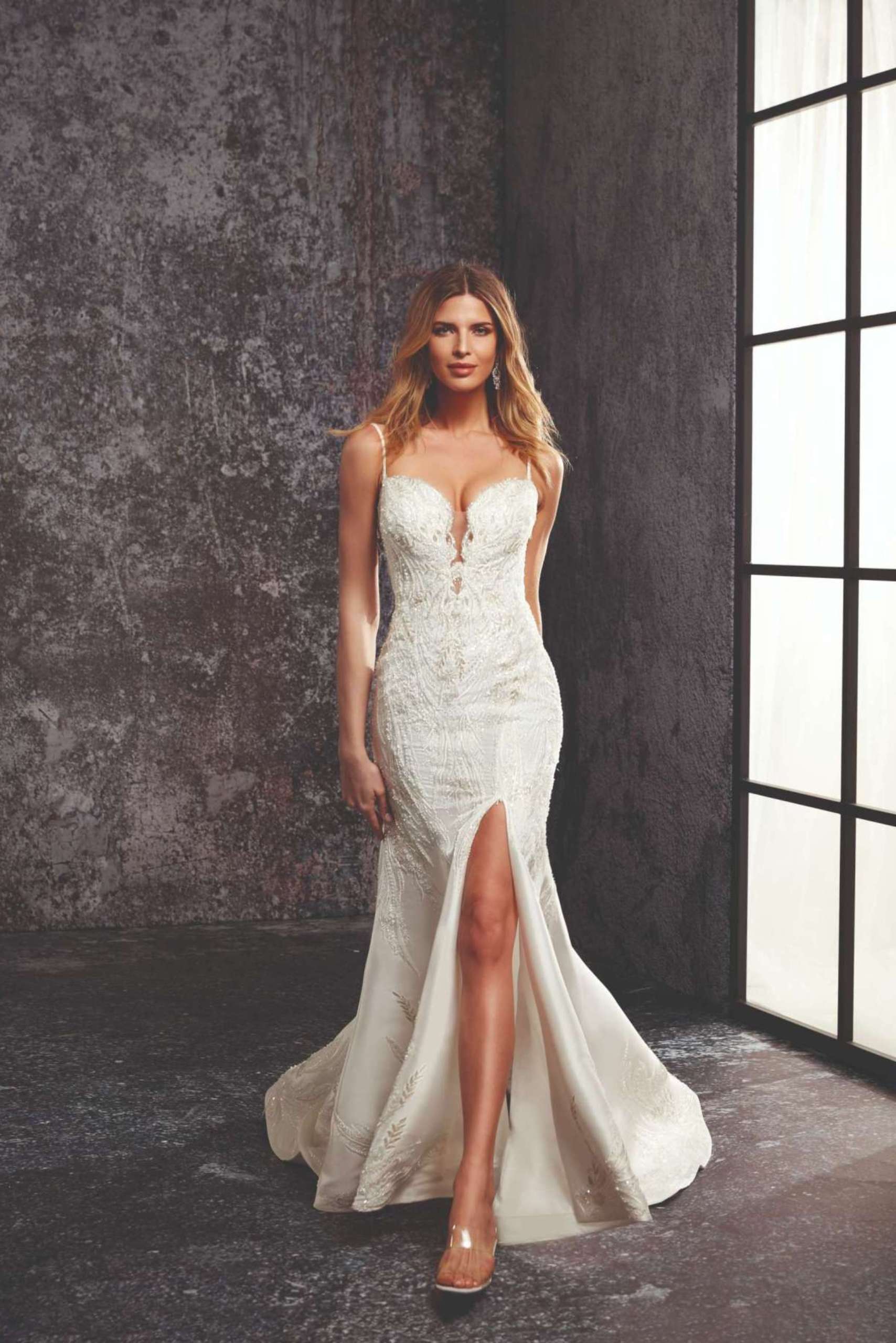 • Mary is defined by its intricate elegance and captivating allure. The delicately structured bodice features a soft plunging neckline framed by fine straps, while cascading beaded lace and embroidery sculpt the silhouette, flowing seamlessly into a sleek skirt with a daring slit that adds fluid movement.