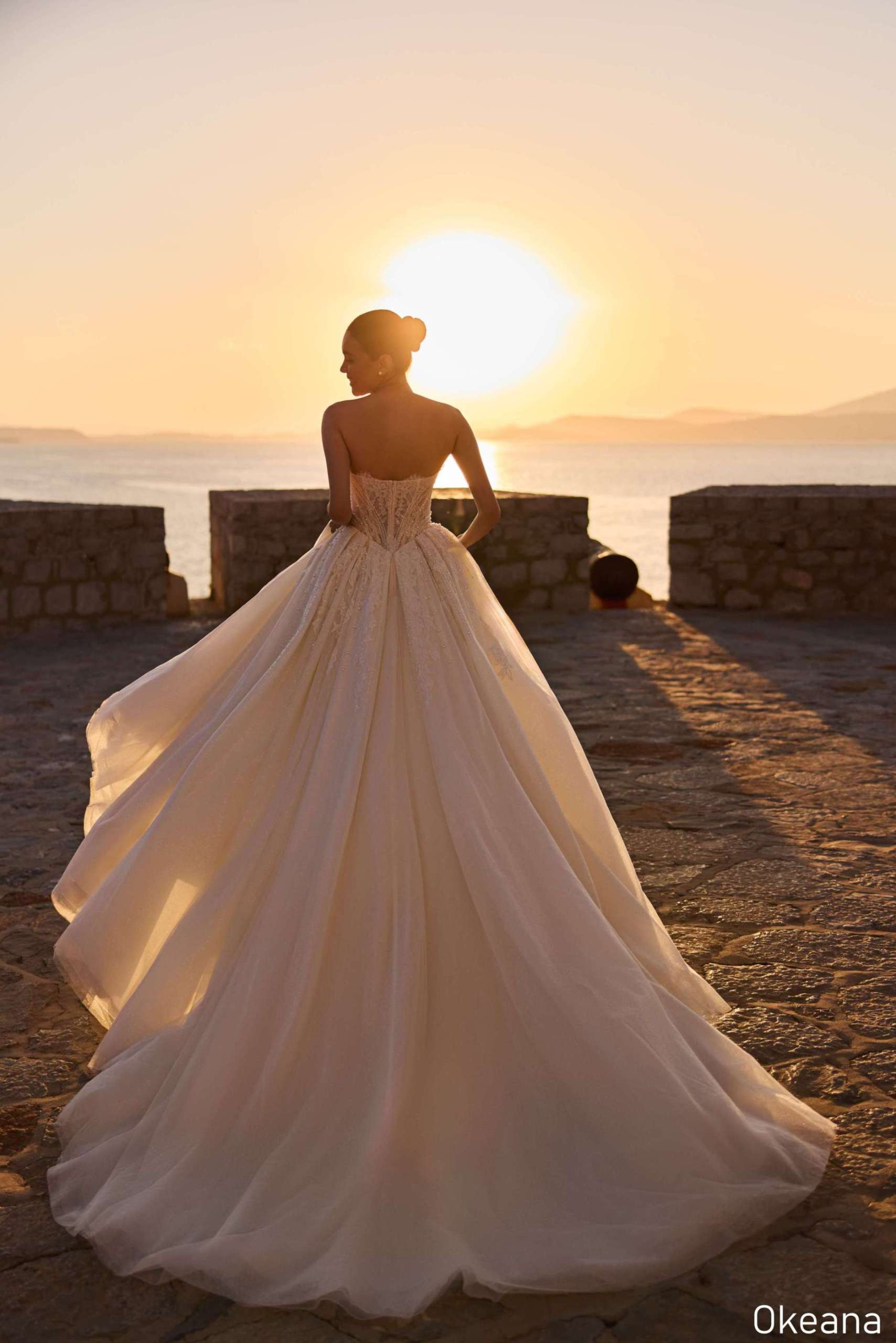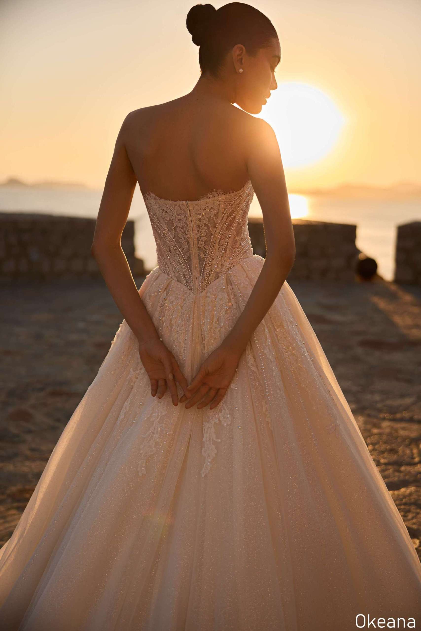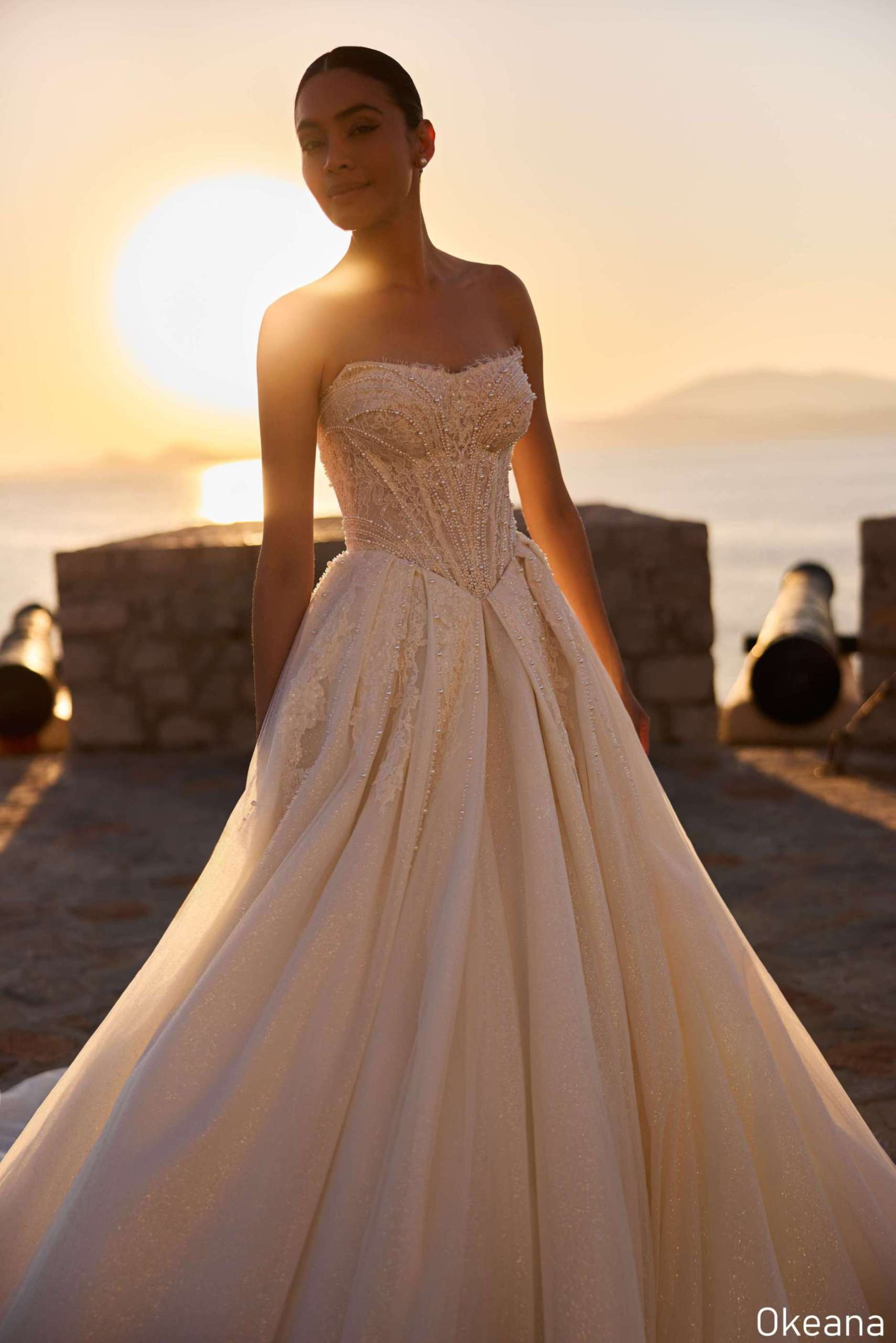 • Okeana is the epitome of opulent bridal artistry. A strapless bustier adorned with pearls and sequins creates depth and dimension, drawing the eye with exquisite craftsmanship.