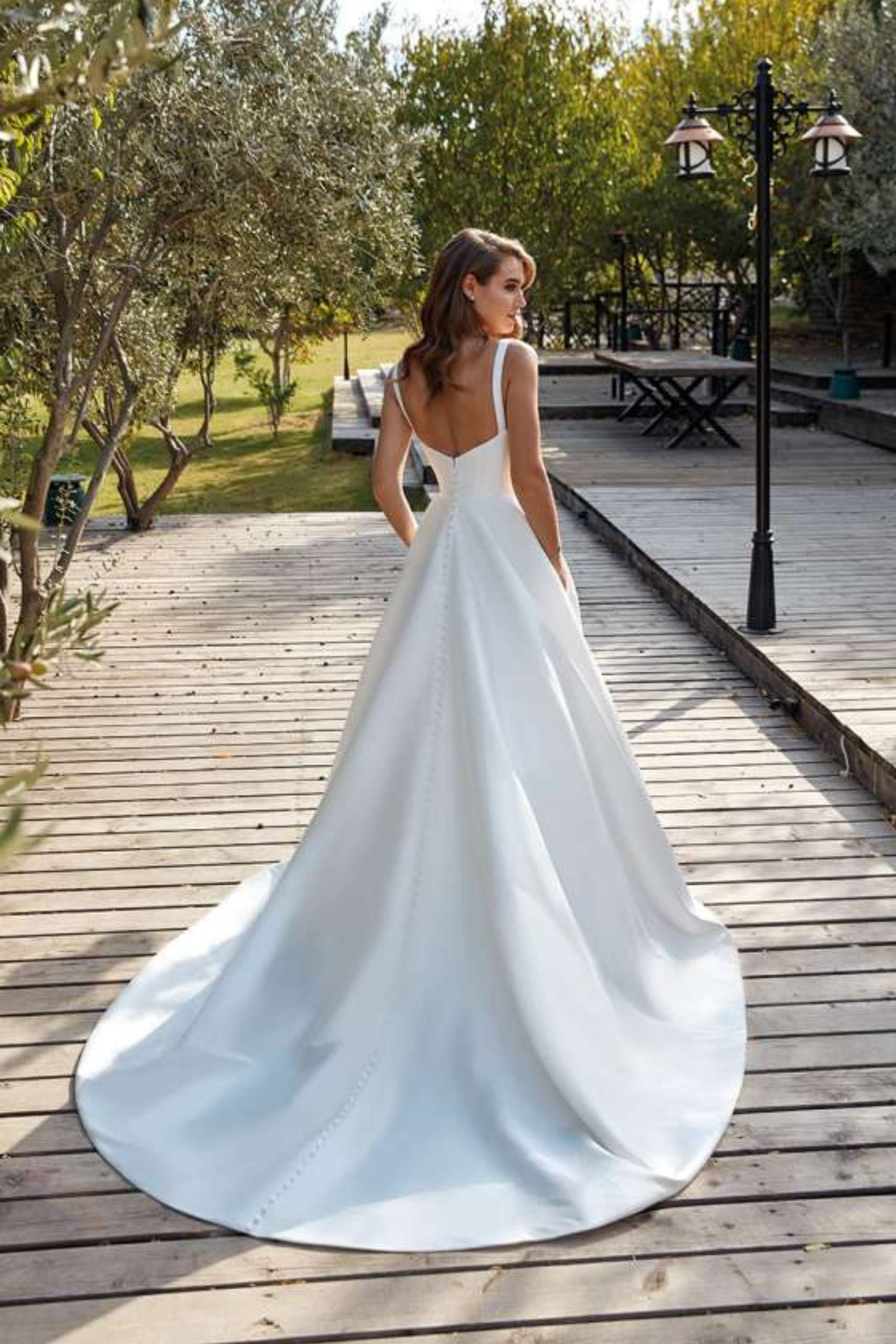 • Riley is a statement of structured grandeur, crafted in exquisite mikado with a full, voluminous skirt that commands presence. The clean lines of the bodice create a striking balance of simplicity and drama.