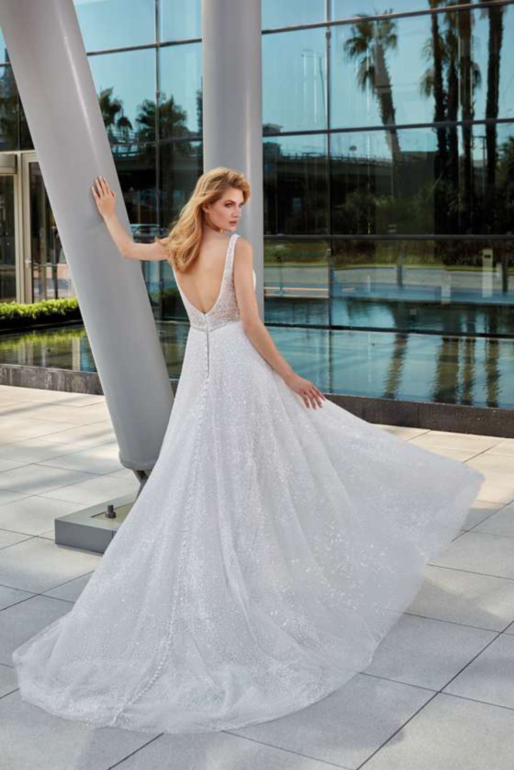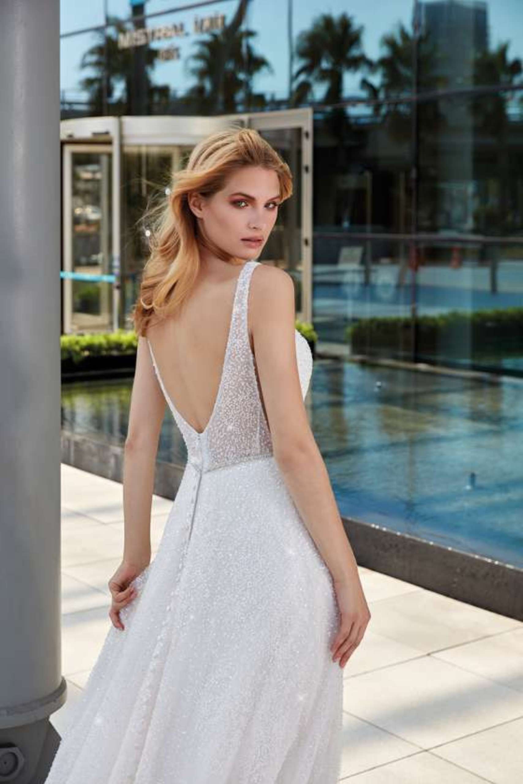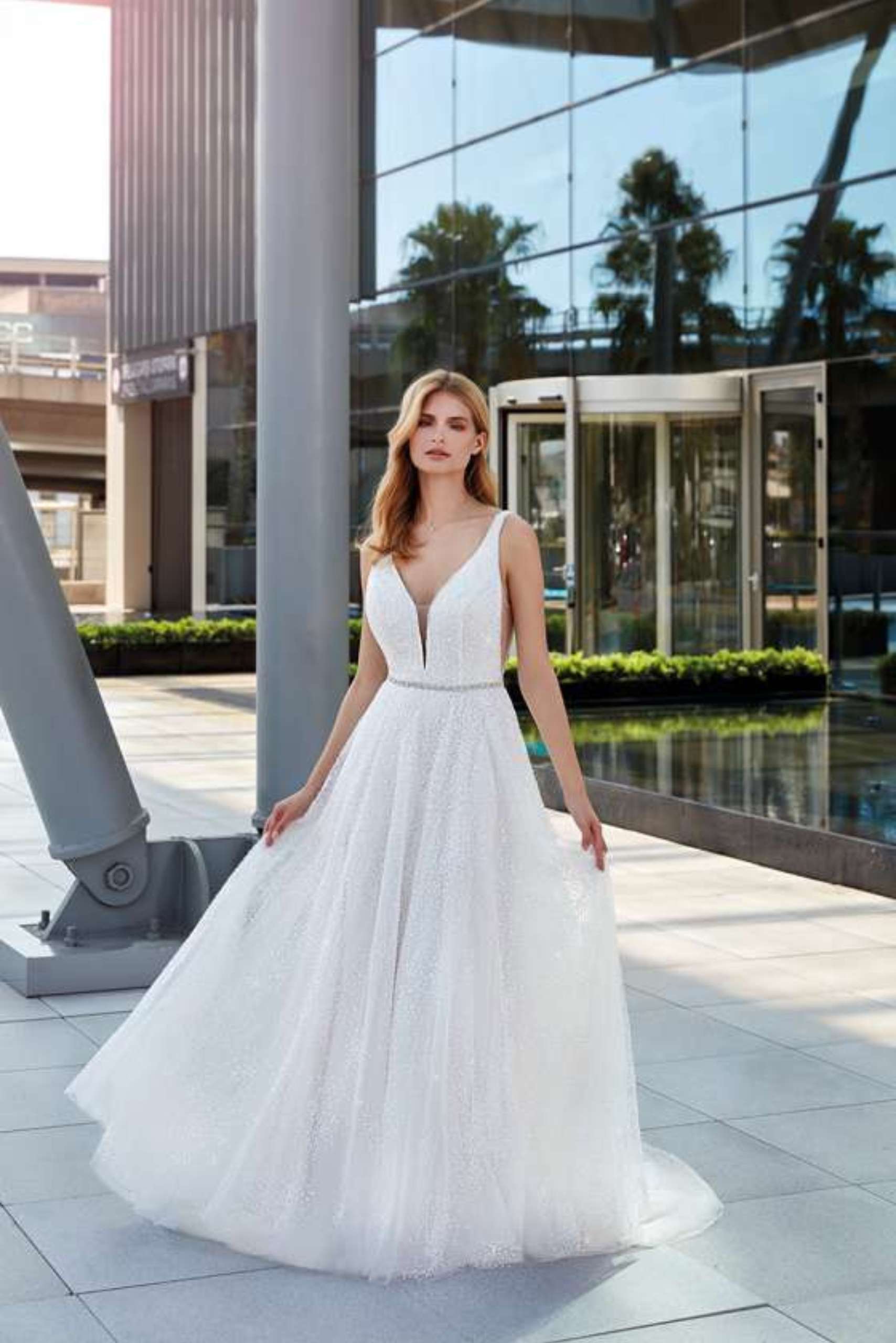 • Star is defined by its luminous simplicity, with all-over beaded tulle that shimmers effortlessly under light. The soft A-line silhouette enhances its graceful, flowing movement.
